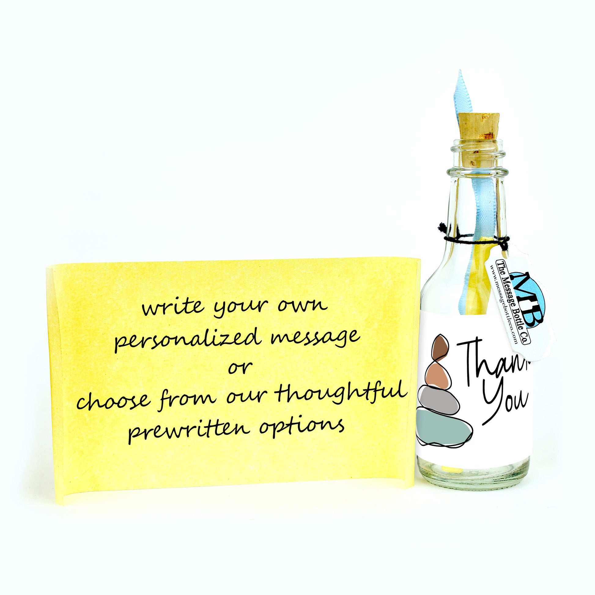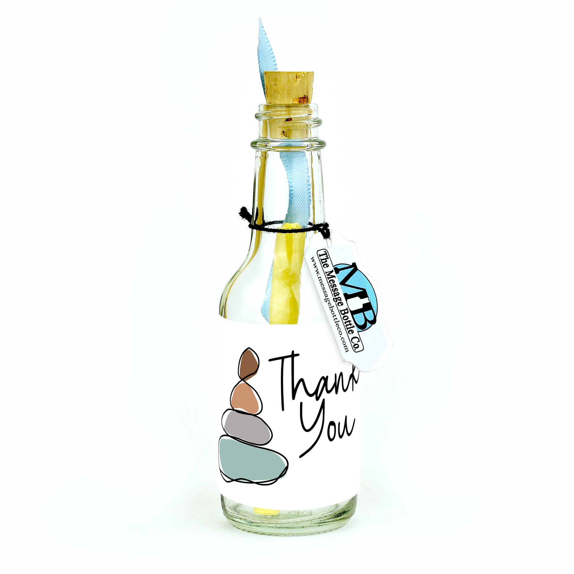 A simple expression of balance and gratitude, the “Stacked in Thanks” Message Bottle embodies calm and thoughtful appreciation. Four hand-drawn stones, stacked with natural hues, sit beneath a gentle handwritten “Thank You,” evoking serenity, stability, and heartfelt recognition.