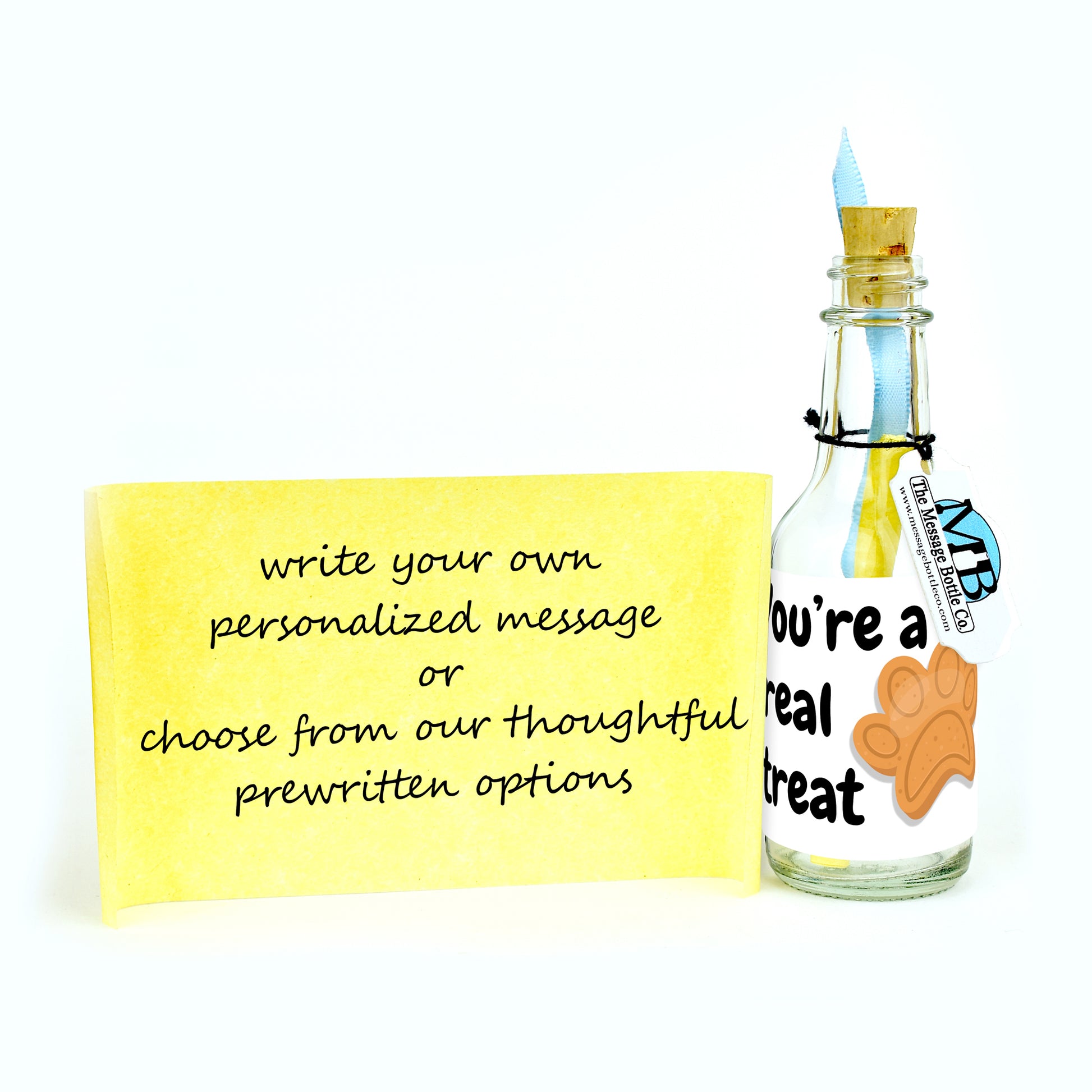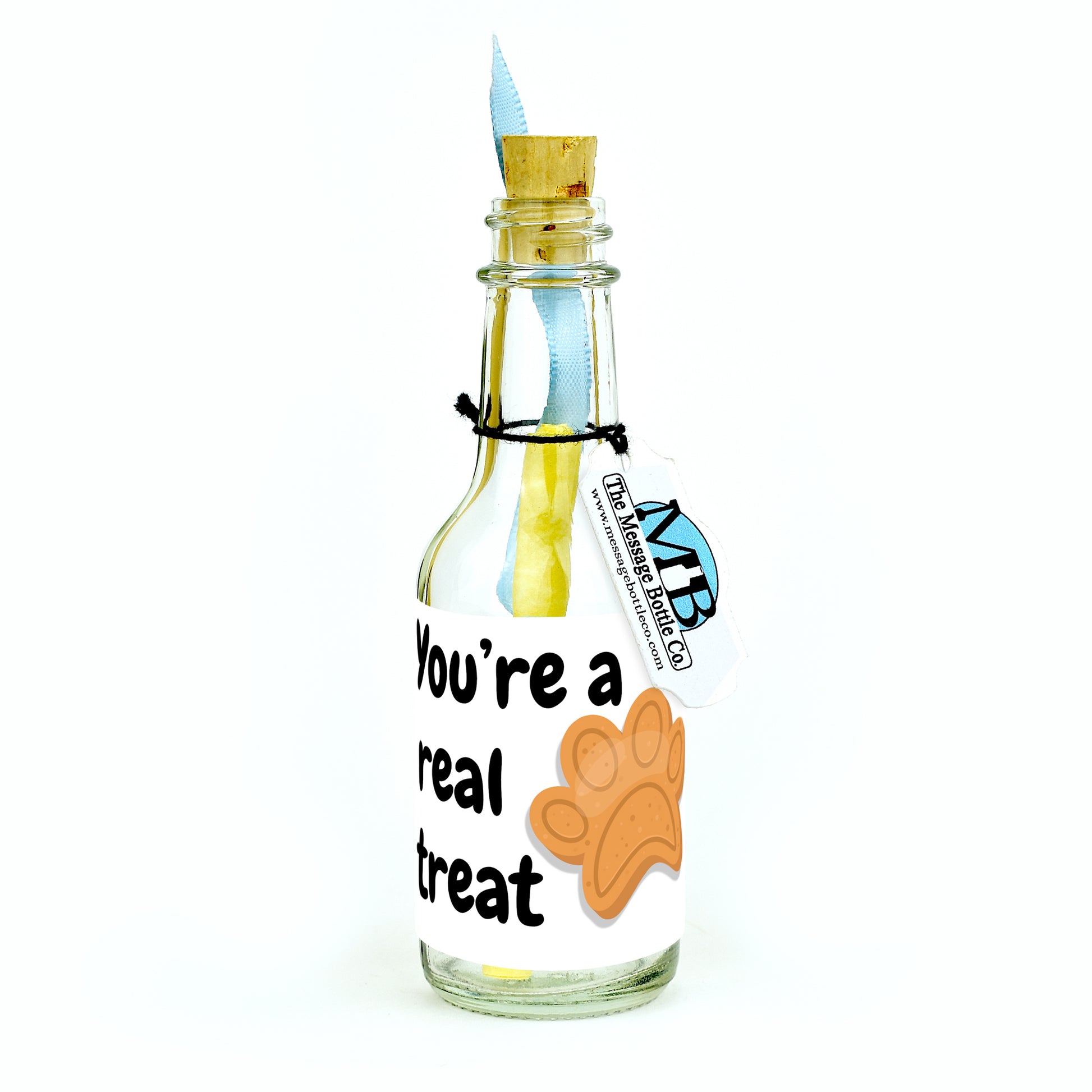 Simple, bold, and irresistibly sweet, the “Such a Treat” Message Bottle delivers gratitude with a smile. A large cartoon pet treat takes center stage against a crisp white background, creating a clean yet playful design that instantly brightens anyone’s day.