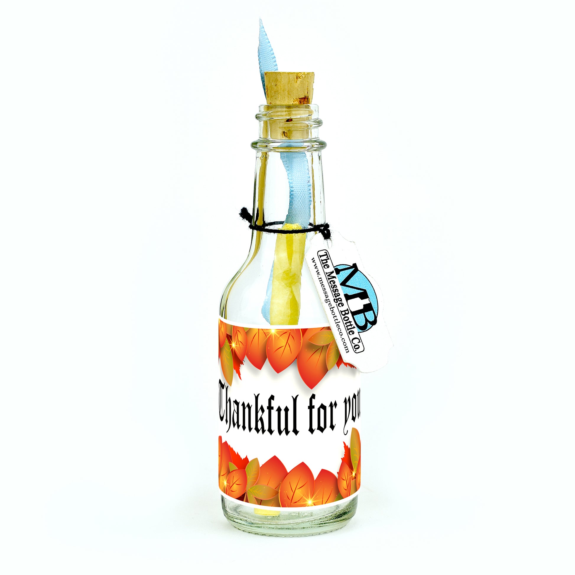 Capture the essence of gratitude and appreciation with our exquisite Message Bottle adorned with fall-colored leaves delicately lining the top and bottom. The label elegantly reads "Thankful for you," encapsulating the sentiment of thanksgiving and the value you place on the special people in your life.