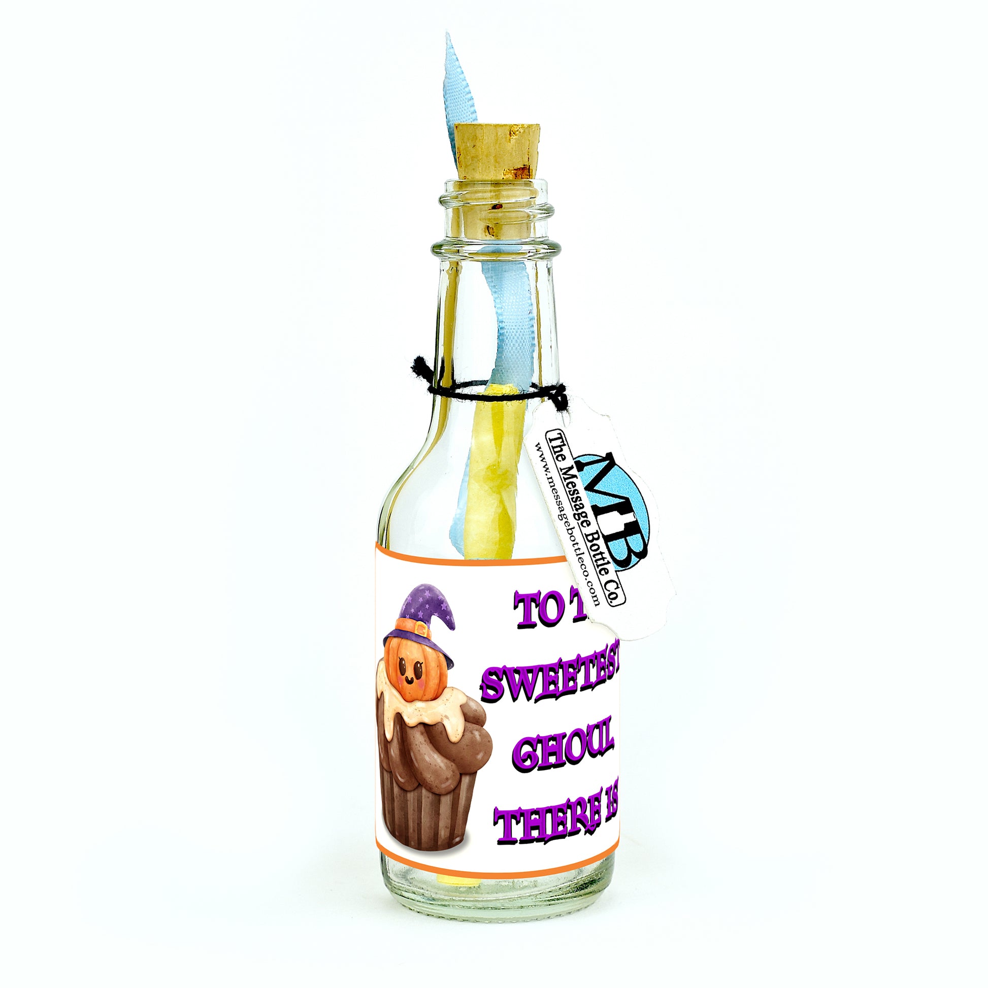 Send a sweet and spooky treat with our "The Sweetest Ghoul" Message Bottle. This playful design features a cartoon cupcake topped with a little jack-o-lantern wearing a witch's hat, adding a dash of Halloween fun to the mix. The charming wordplay on "ghoul" instead of "girl" makes it perfect for sending to a special someone, whether it's a significant other, a friend, or a sister.