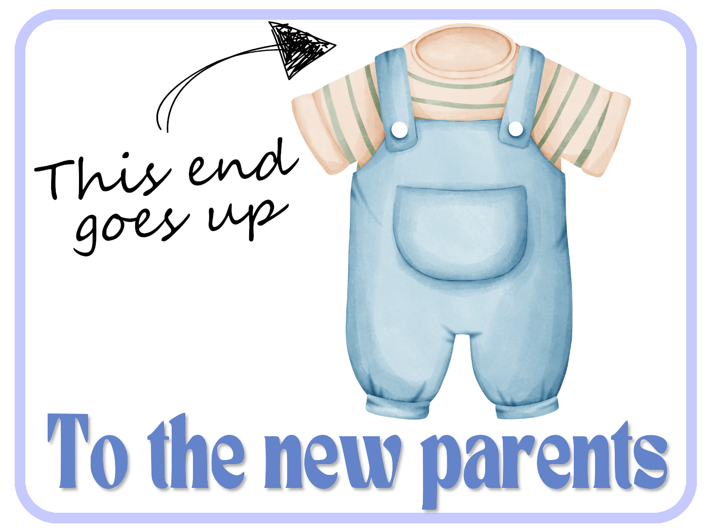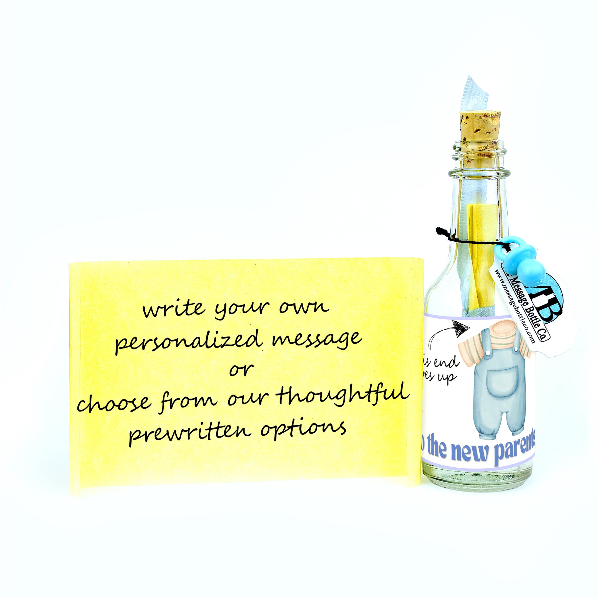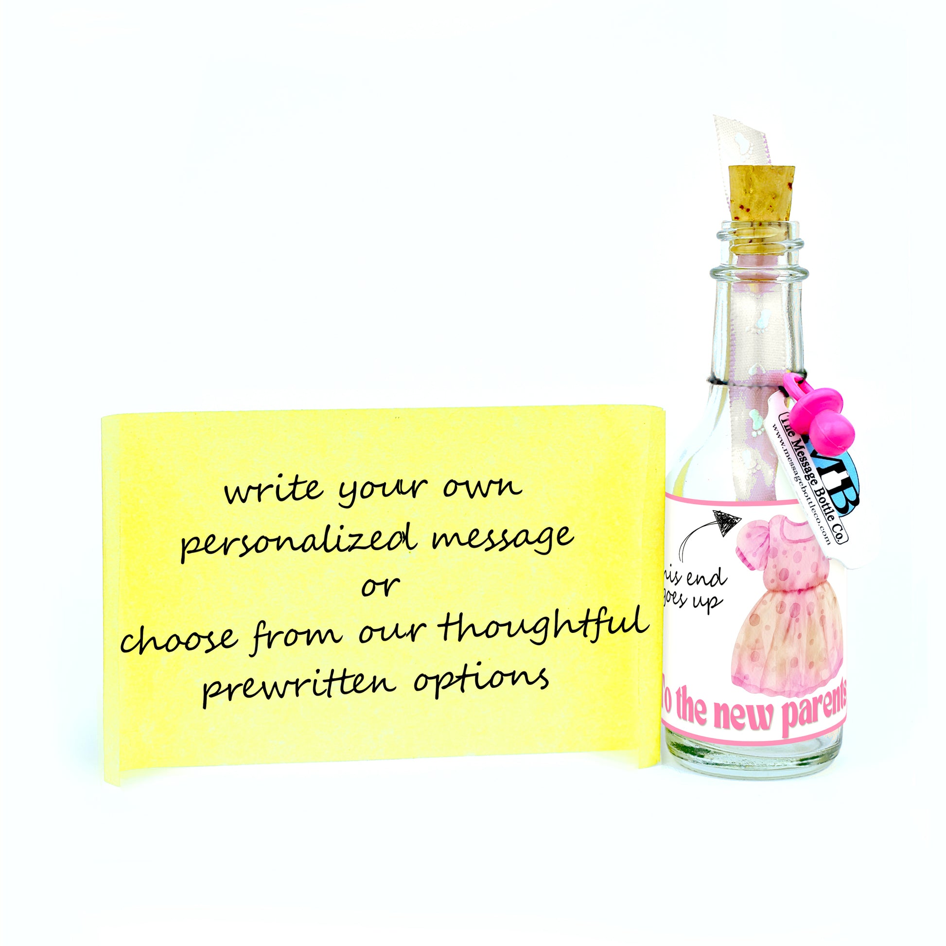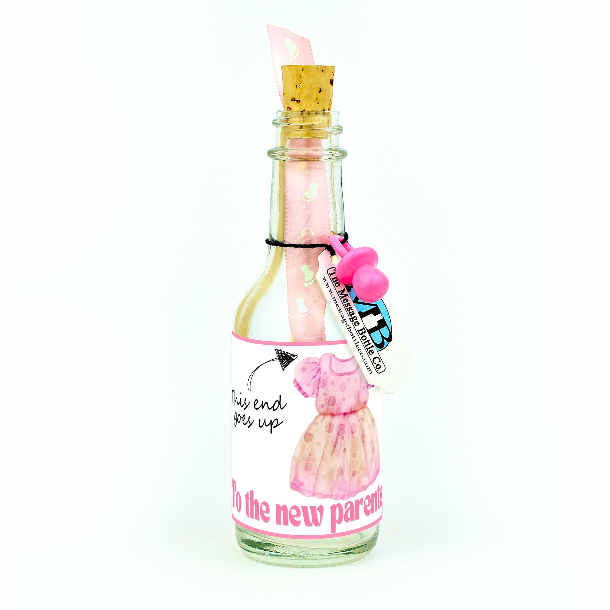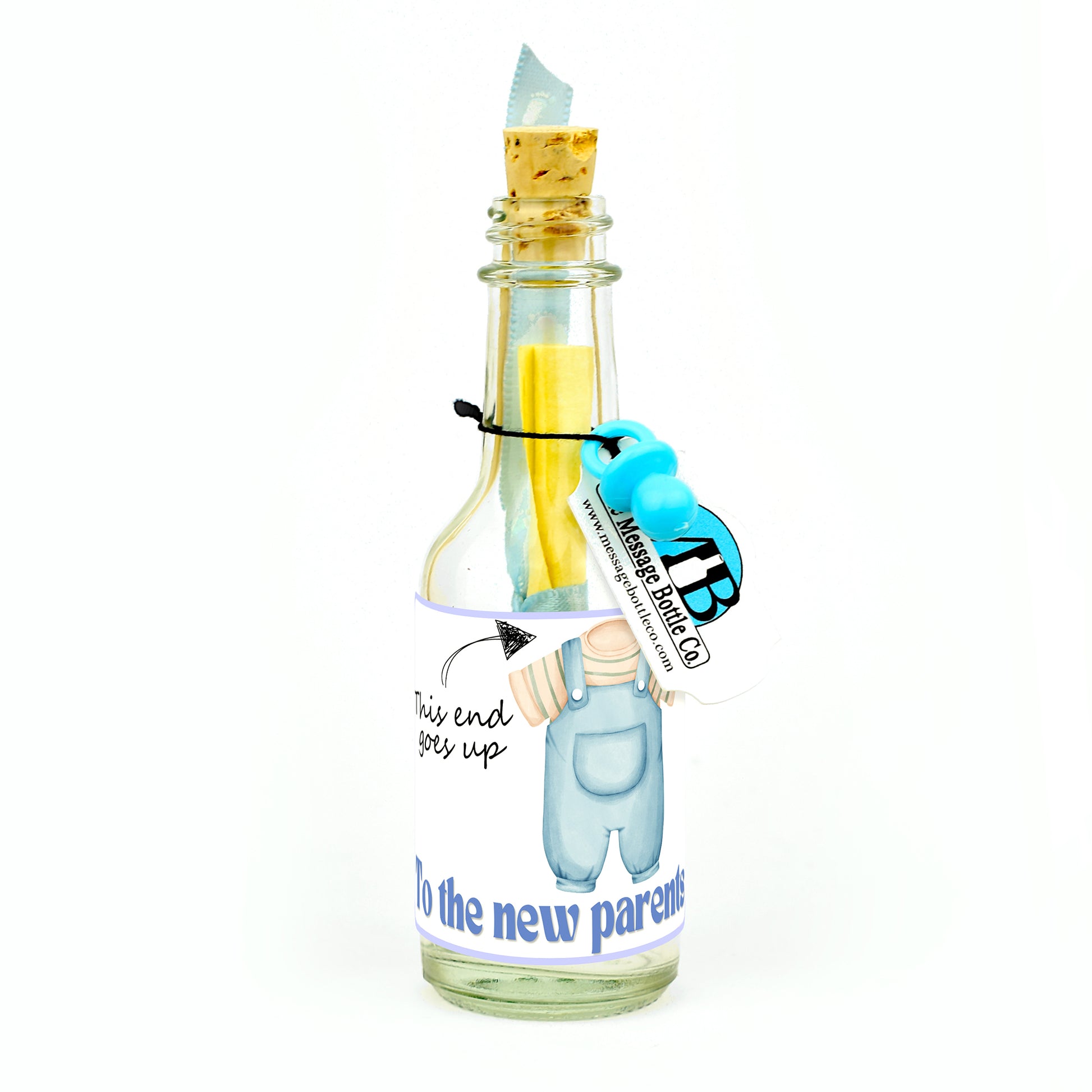 Welcome the newest arrival with a touch of humor and charm with our "This End Up" Message Bottle! This playful design features a cute outfit for the baby: overalls and a t-shirt for boys, and a pretty pink dress for girls. The phrase "This End Goes Up" is accompanied by a helpful arrow pointing to where the baby's head would be, adding a light-hearted joke for first-time parents.