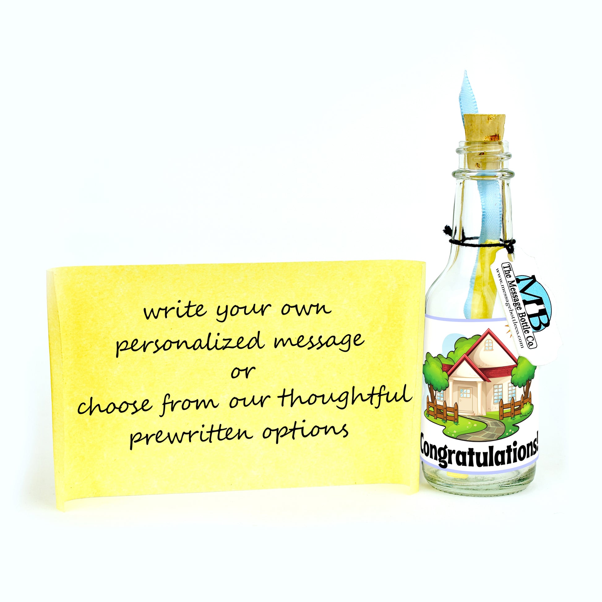 Celebrate the excitement of buying a new home with our "Welcome Home Wishes" Message Bottles, offered in two charming versions. The first version features a simple yet heartfelt "Congratulations" alongside a delightful house illustration, perfect for extending warm wishes as they embark on their new journey.