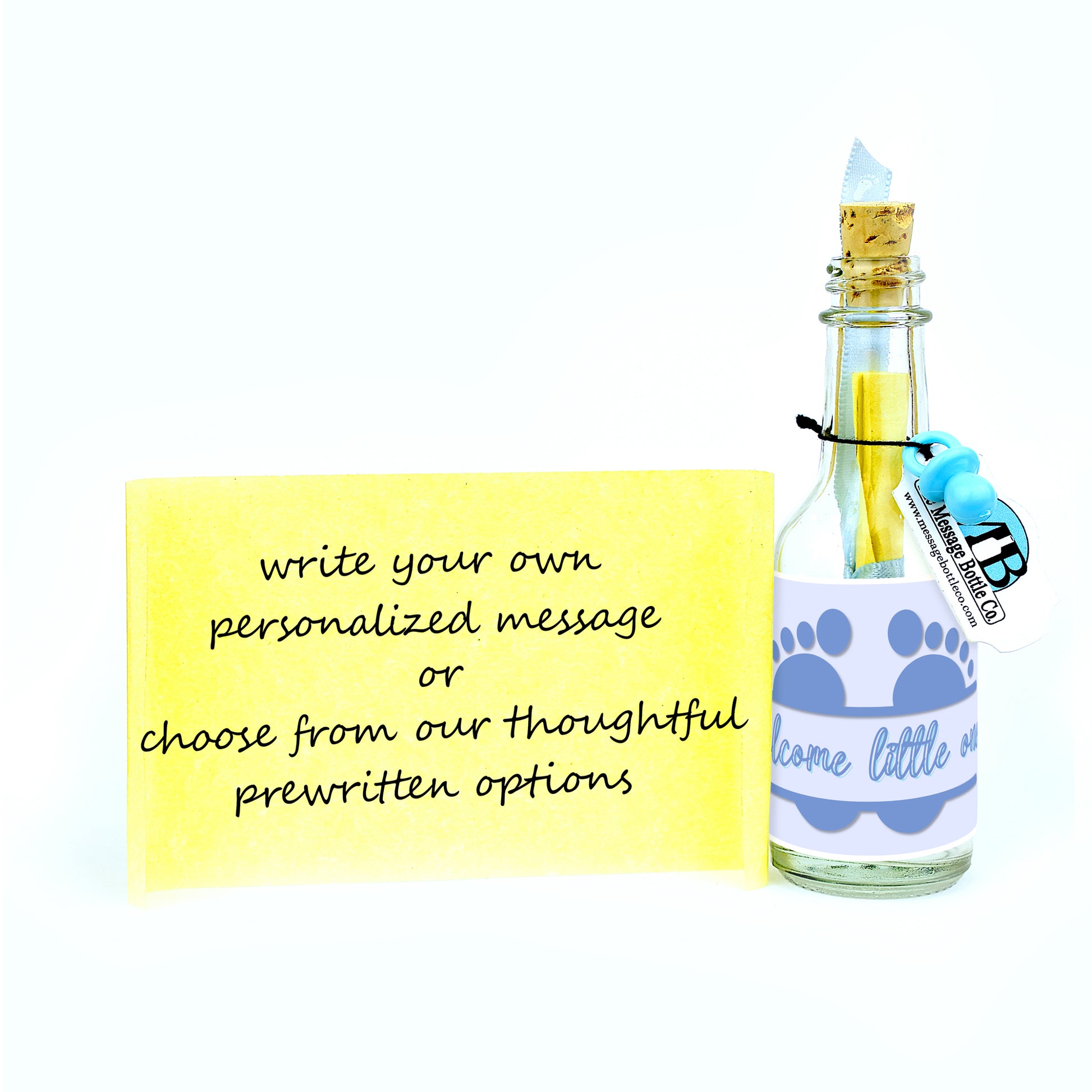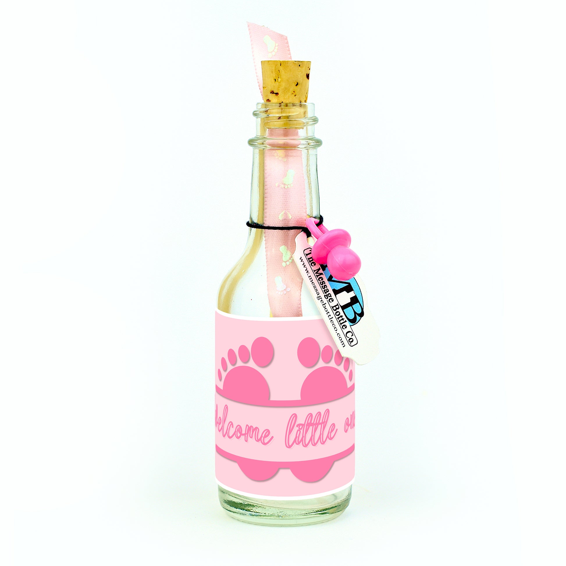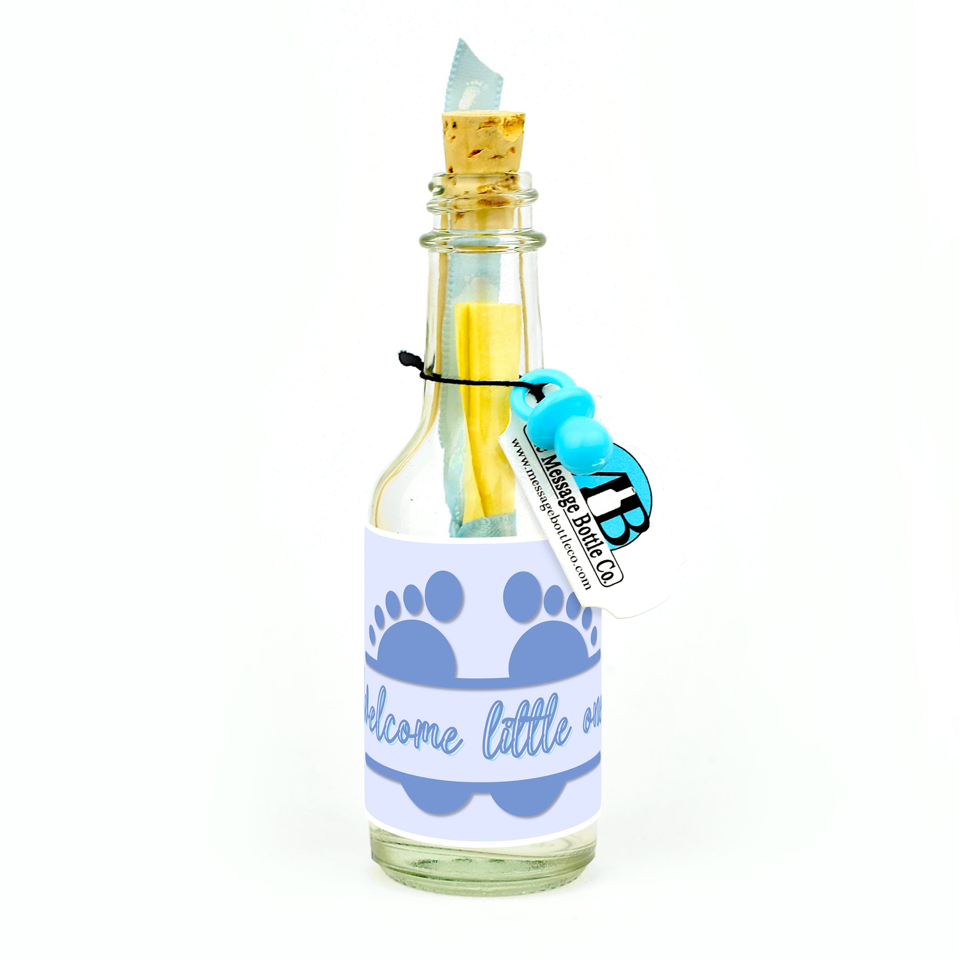 Celebrate the arrival of a new baby with our delightful "Welcome Little One" Message Bottle! This design features a big, cute pair of baby footprints, with the welcoming phrase "Welcome Little One" prominently displayed across the middle. It's a charming way to mark the beginning of a new adventure for both the baby and the parents. Available in two sweet versions—one with a pink theme for girls and another with a blue theme for boys—this Message Bottle makes a perfect gift for any newborn.