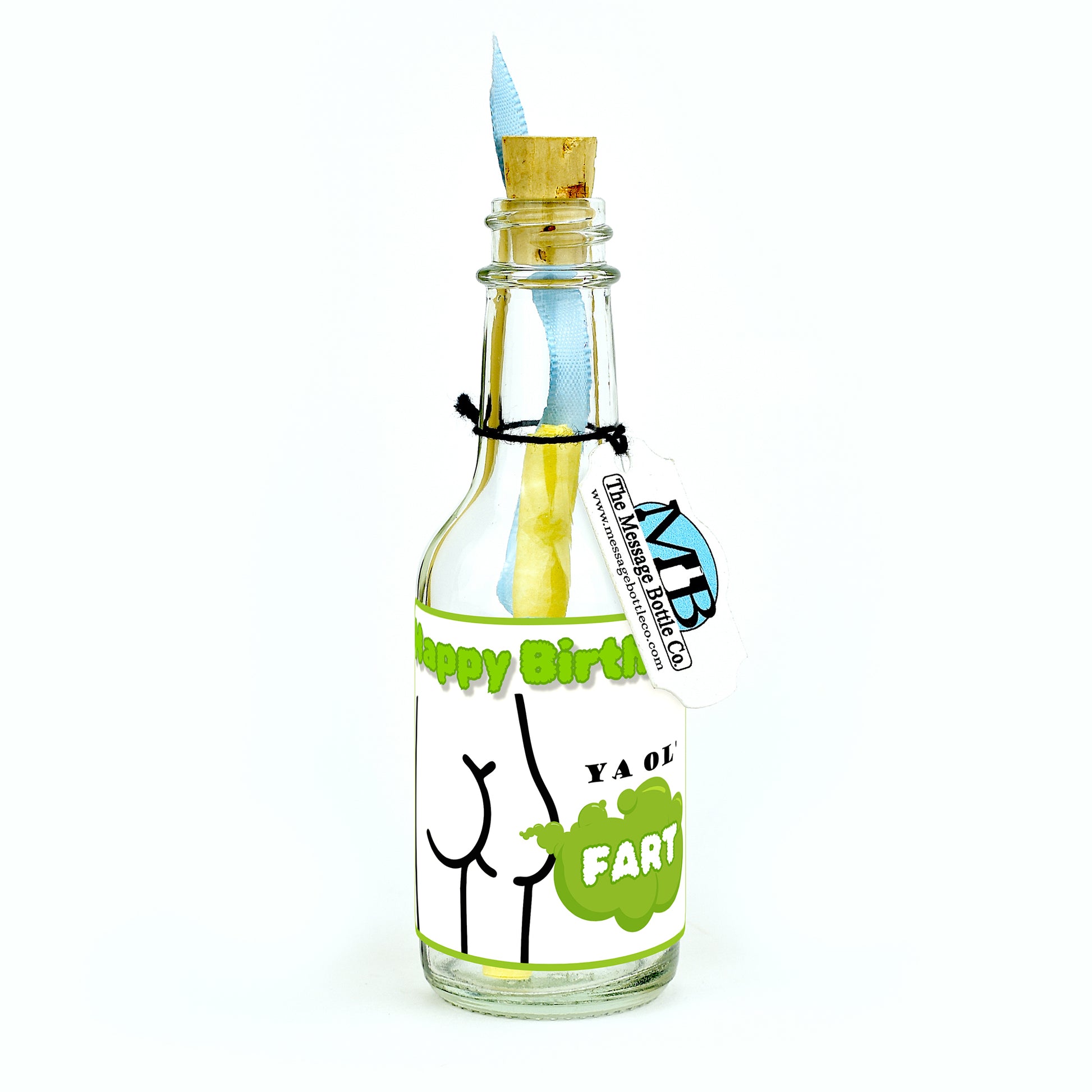 Embrace the humor of growing older with our "Ya Ol' Fart" Message Bottle. Featuring a cheeky illustration of a butt and a green fart cloud, this playful and lighthearted label is perfect for those who appreciate a good laugh—especially on their special day.