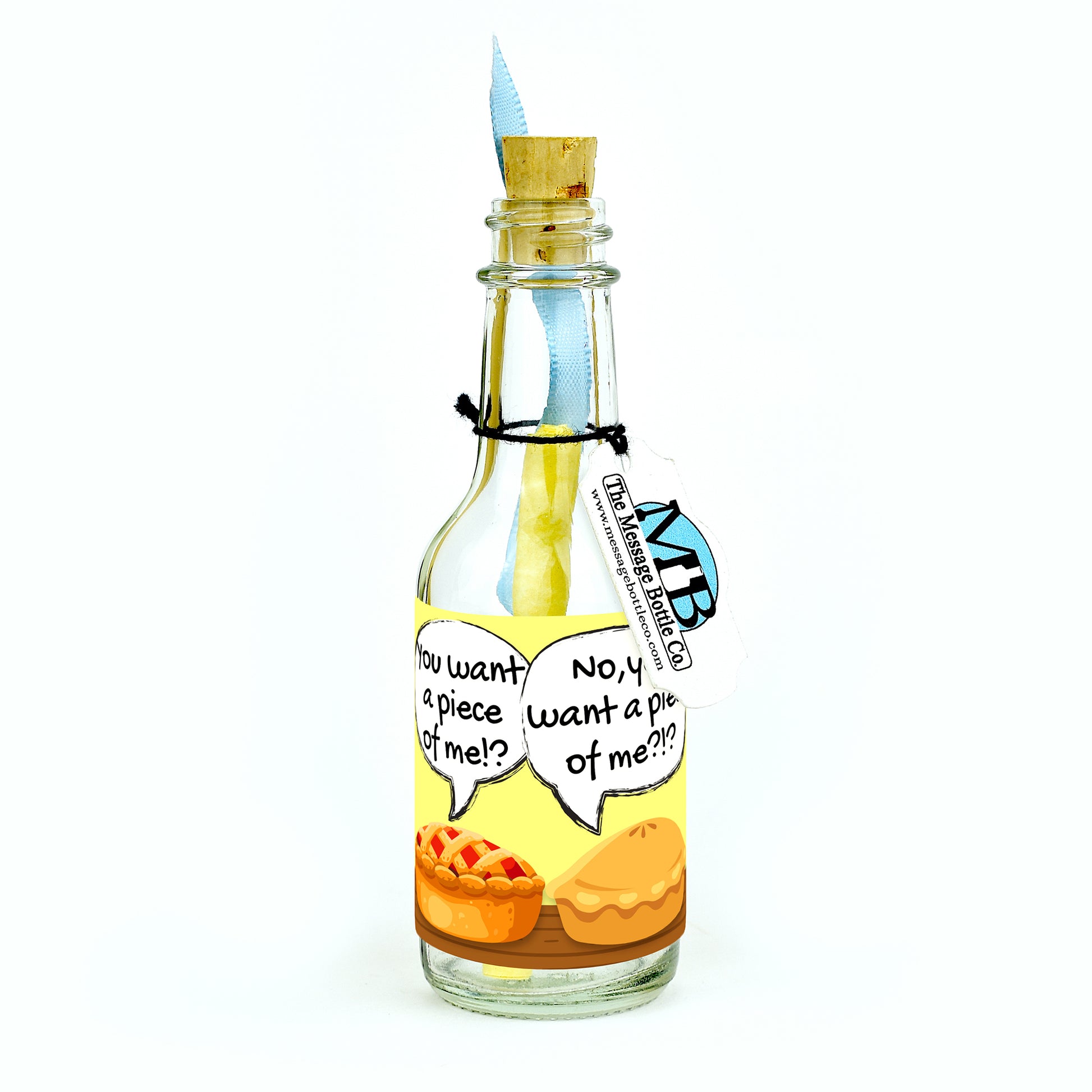 Featuring a delightful duo of a cherry pie and an apple pie in a friendly face-off, this Message Bottle serves up Thanksgiving fun with a touch of attitude! Each pie playfully claims, “You want a piece of me!?” making this bottle a sweet and sassy addition to your holiday greetings.