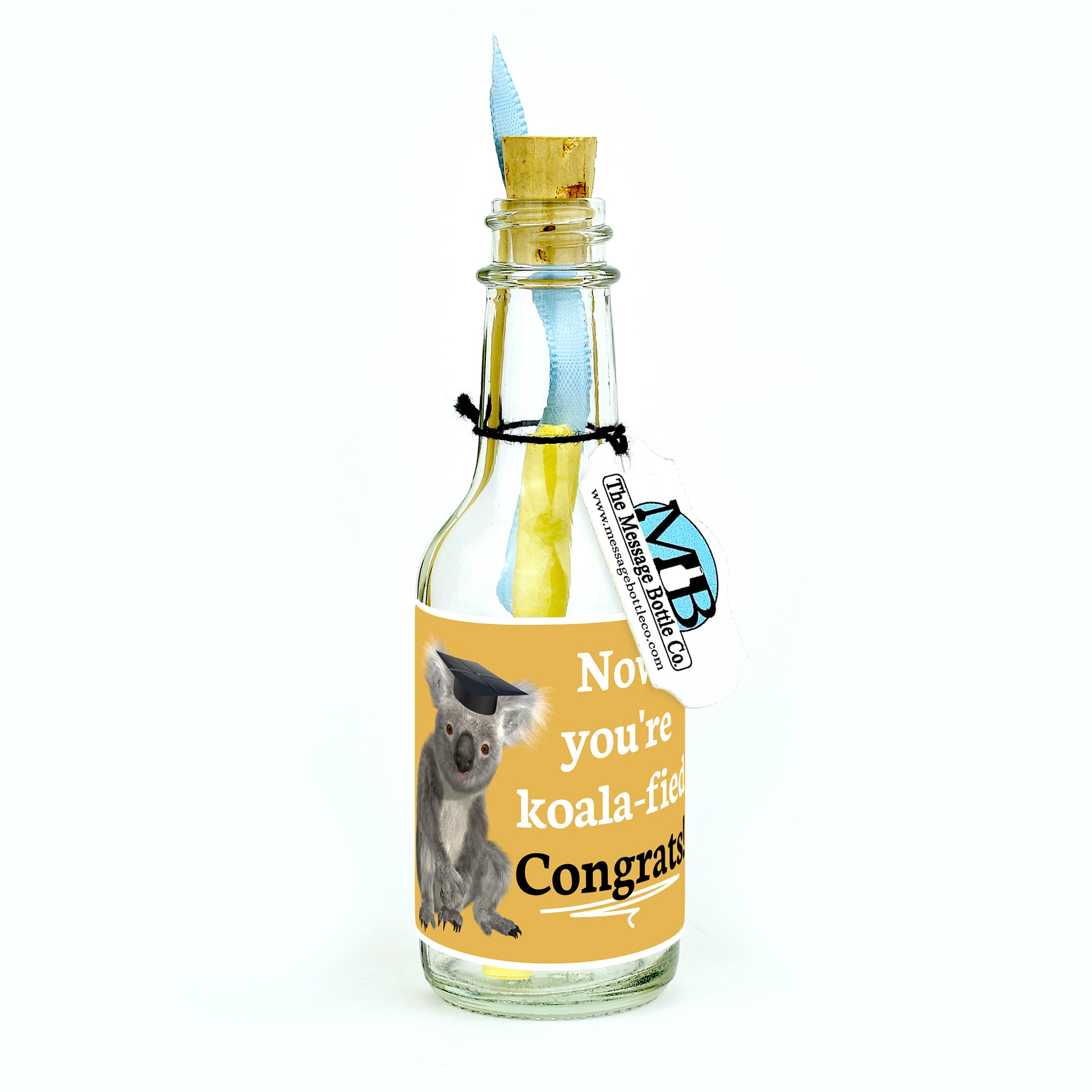 Celebrate their journey to success with our delightful "You're Koala-fied" Message Bottle. Featuring an endearing illustration of a koala donning a graduation cap, this label symbolizes your hard-earned qualification with charm and warmth.